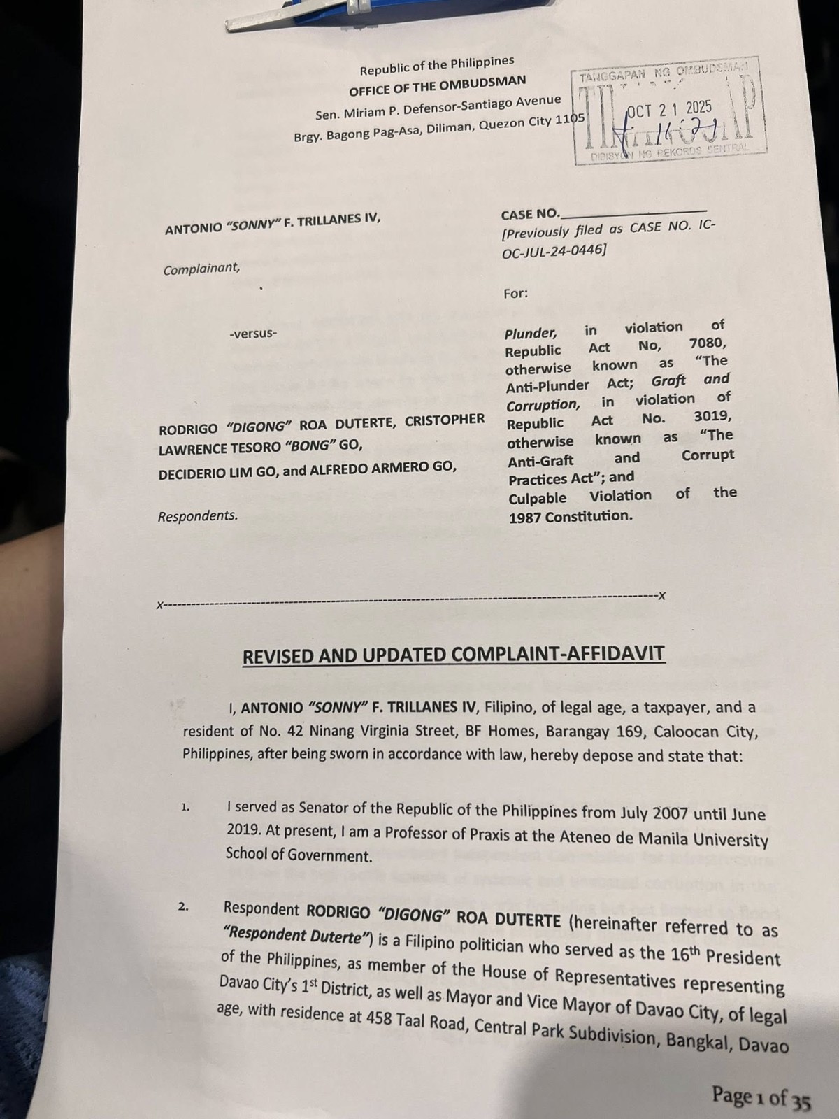 Dua a kabagian ni Go ti nairaman iti kaso nga impila ni Trillanes iti Office of the Ombudsman (OMB) ita nga aldaw, Oktubre 21, gapu iti panaglabsing iti Plunder Law (Republic Act No. 7080), iti Anti-Graft and Corrupt Practices Act (Republic Act No. 3019), ken iti Code of Conduct and Ethical Standards for Public Officials and Employees (Republic Act No. 6713).