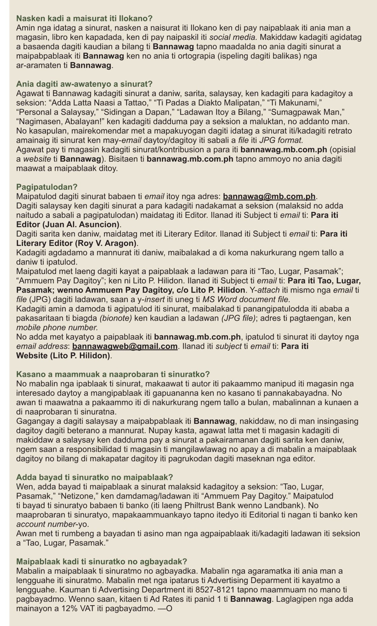 Amin nga idatag a sinurat, nasken a naisurat iti Ilokano ken di pay naipablaak iti ania man a magasin, libro ken kapadada, ken di pay naipaskil iti social media. Makiddaw kadagiti agidatag a basaenda dagiti kaudian a bilang ti Bannawag tapno maadalda no ania dagiti sinurat a maipabpablaak iti Bannawag ken no ania ti ortograpia (ispeling dagiti balikas) nga ar-aramaten ti Bannawag.